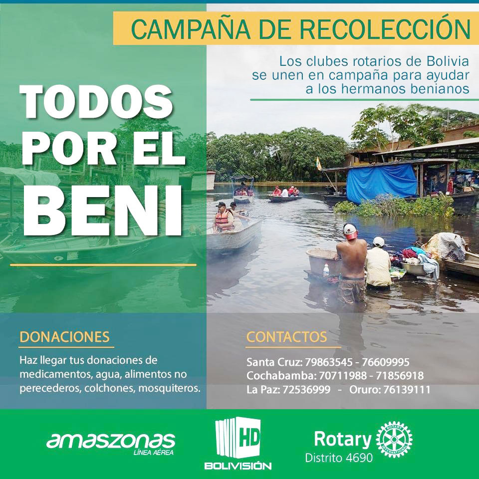 Proyecto todos por el Beni Proyecto todos por el Beni En el marco de la campaña de recolección para ayudar a los hermanos damnificados por las inundaciones en el Departamento Beni, el 25 de marzo del año en curso el RC Chuquiago Marka hizo la donación de: 40 Kits de medicamentosAntigripalIbuprofenoAspirinaOmeoprazolAzitromicinaClaritromicinaLevofloxacinoVitaminasZincOmega 3Ropa variada