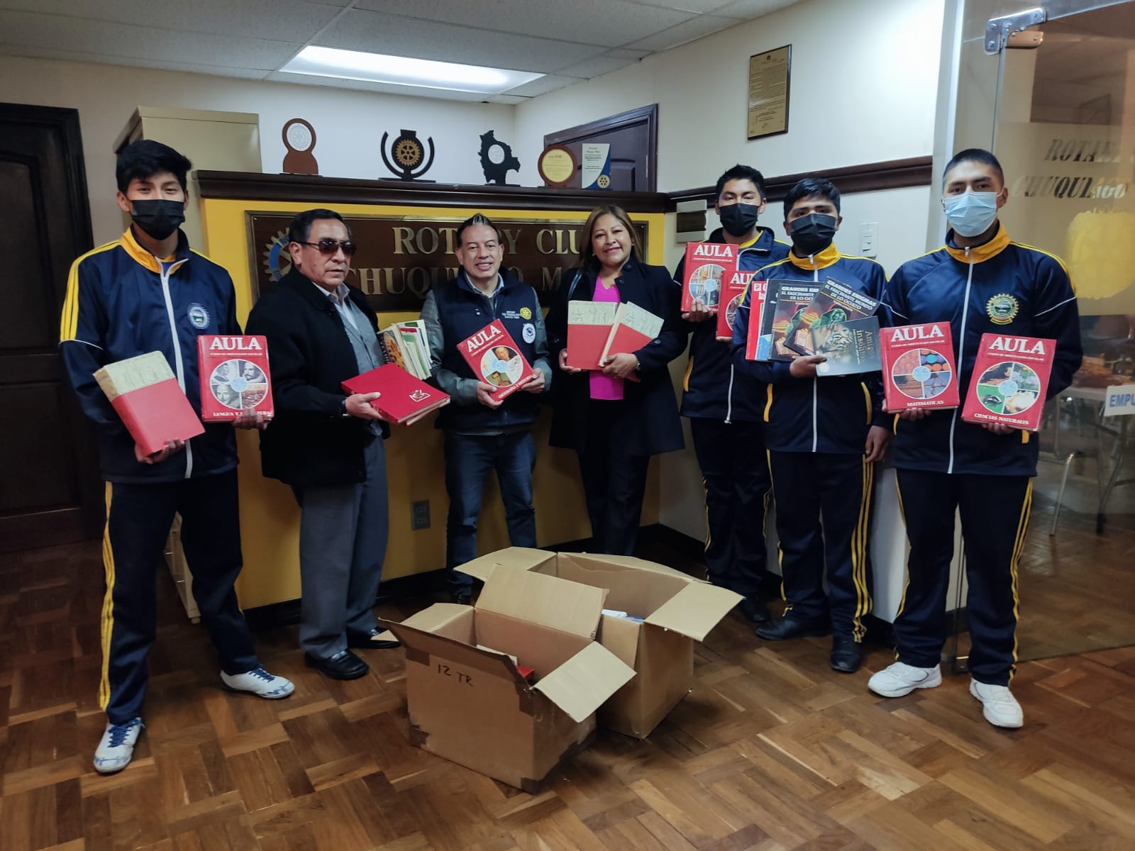 La entrega de 79 textos entre libros e enciclopedias del Rotary Club Chuquiago Marka a la Unidad Educativa Rotary Club Chuquiago Marka contó con la presencia de la Directora Lorena Gómez y del Profesor Kemper y alumnos de la Promoción.